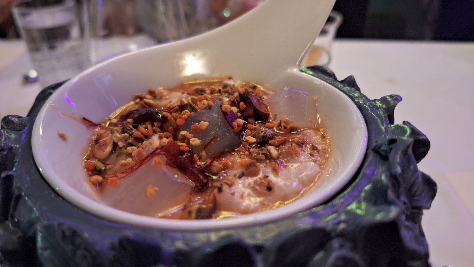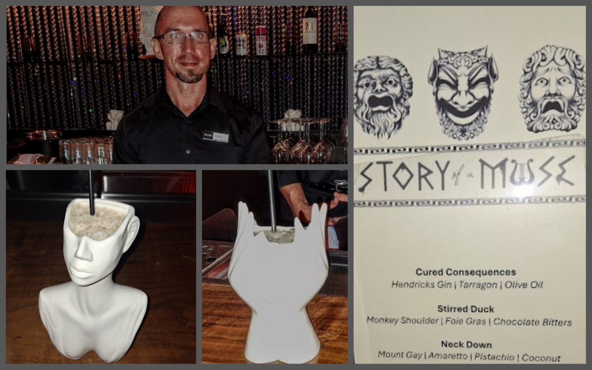 "Story of a Muse" is a limited-run dinner series inspired by the Melpomene, the Greek Muse of Tragedy. Her name encourages celebration through song and dance, yet Chef Persh prefers to take a different path. She describes her event as "a gastronomic homage to the power of inspiration, love, loss, memory, and the duality of life". [embed]https://youtu.be/amuNBlUa4JE?si=er3lFsz_KXmigfQw[/embed] "Story of a Muse" occurs in a spot formerly occupied by NOVE Italian Restaurant. A private, secure elevator whisks you upward to a cavernous space that's simultaneously foreboding and inviting. Floor-to-ceiling windows allow you to drink in the magnificence of the Las Vegas skyline while you prepare for a trip through time.