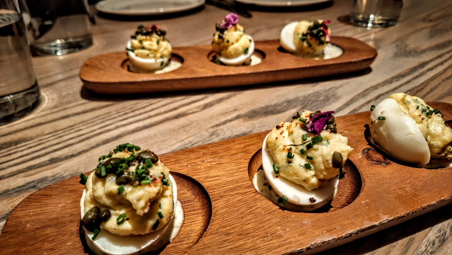 The main menu (available here) is separated into "Starters", "Signature Guacamole", "Veggies", "Raw & Chilled", "Salads", "Sandwiches", "Tacos", "Pasta", "Pizza", and "Summer Comfort". Our group began by sharing two orders of Potato Salad Deviled Eggs with Chino Valley Ranch ($9.95 for three pieces). Additional selections include Warm Edamame, Jalapeño Corn Bread, Cheesy Dream Puffs, and Prime Beef Meatballs.