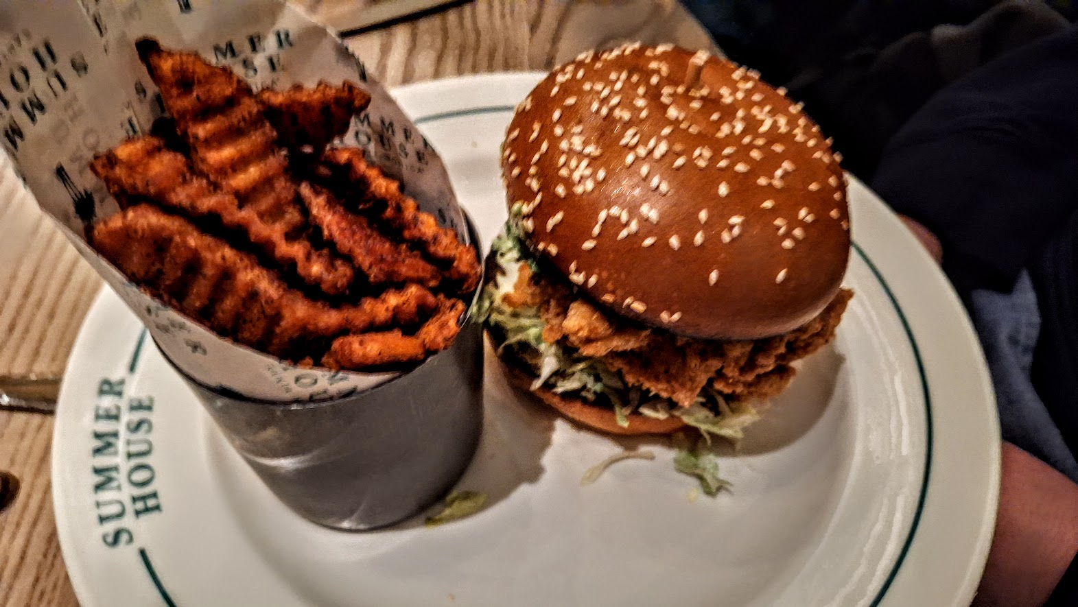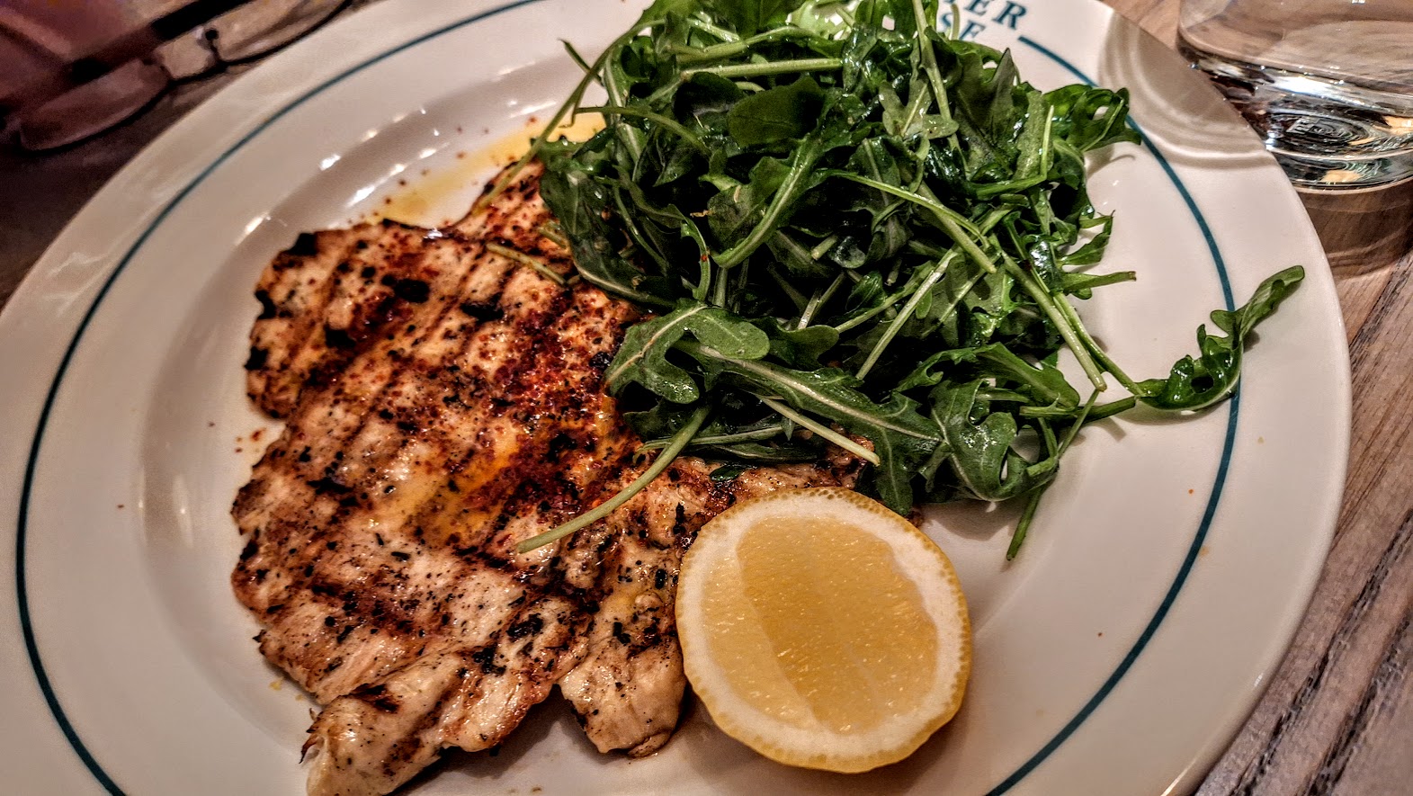 The lovely lady of our party selected an Herbed Chicken Breast Paillard for her entree. It's a pounded, grilled cutlet topped with Calabrian chili and accompanied by arugula salad ($18.95). This selection was recommended by our server. It appears on the "Summer Comfort" section of the menu, which also offers Center-Cut Filet Mignon ($52.95), Corn Husk Salmon ($38.95), and a Picnic Fried Chicken Basket ($22.95).