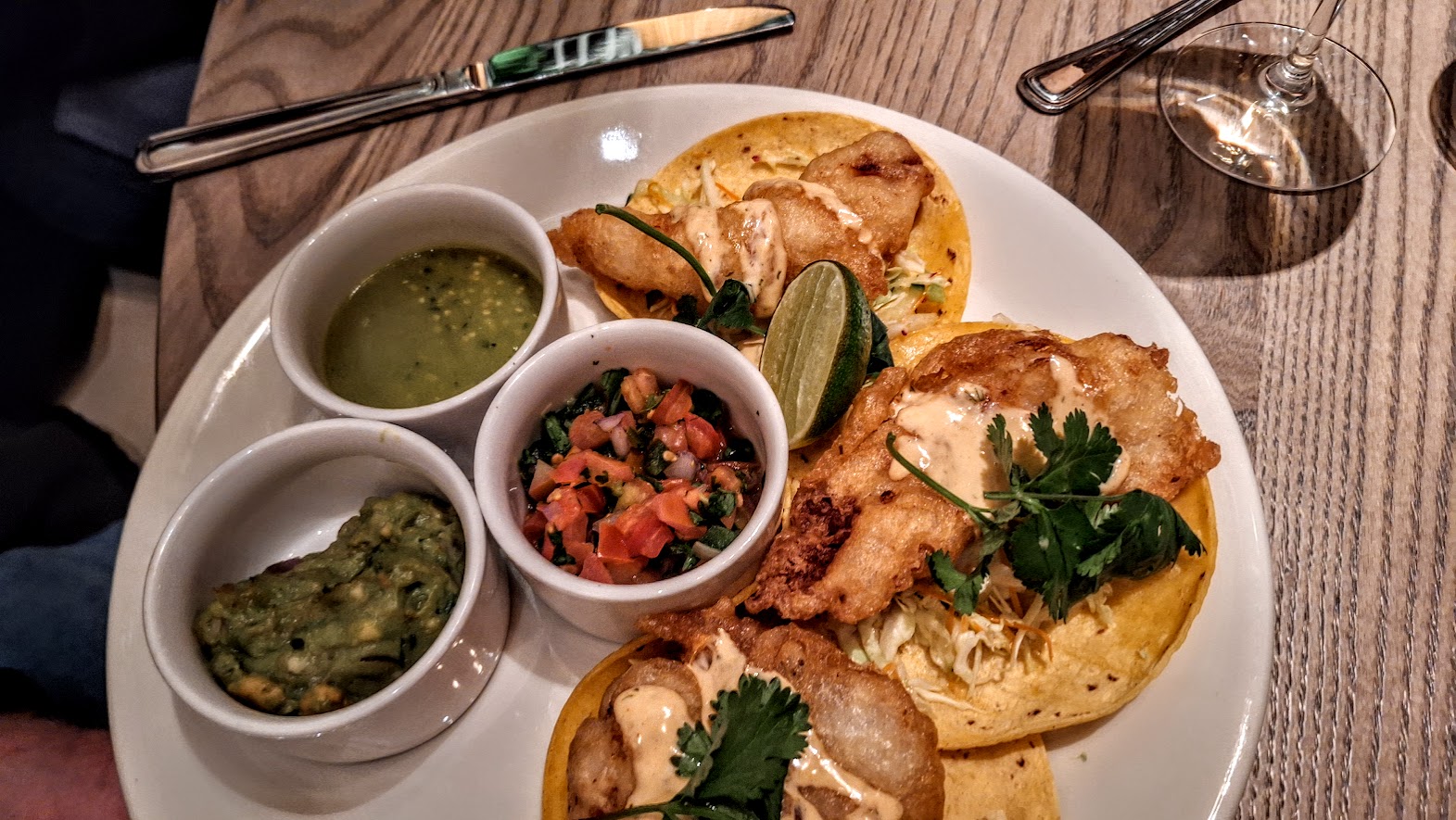 Our visiting gentleman chose Crispy Fish Tacos ($22.95), prepared in a light tempura batter and presented with chipotle crema and guacamole. Other taco selections include Grilled Tequila-Lime Chicken ($19.95) and Carne Asada ($28.95) made with grilled skirt steak, queso, and poblano rajas.
