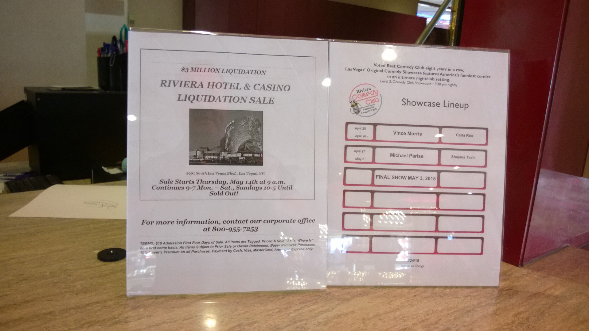 One genial lady manned the Riviera box office, selling tickets to the final performances on May 3rd. To one side of her counter was an information sheet on the upcoming liquidation of furniture, fixtures, and supplies.