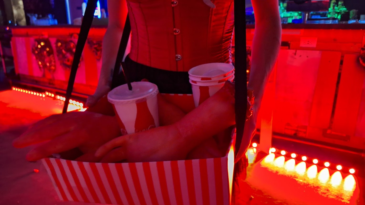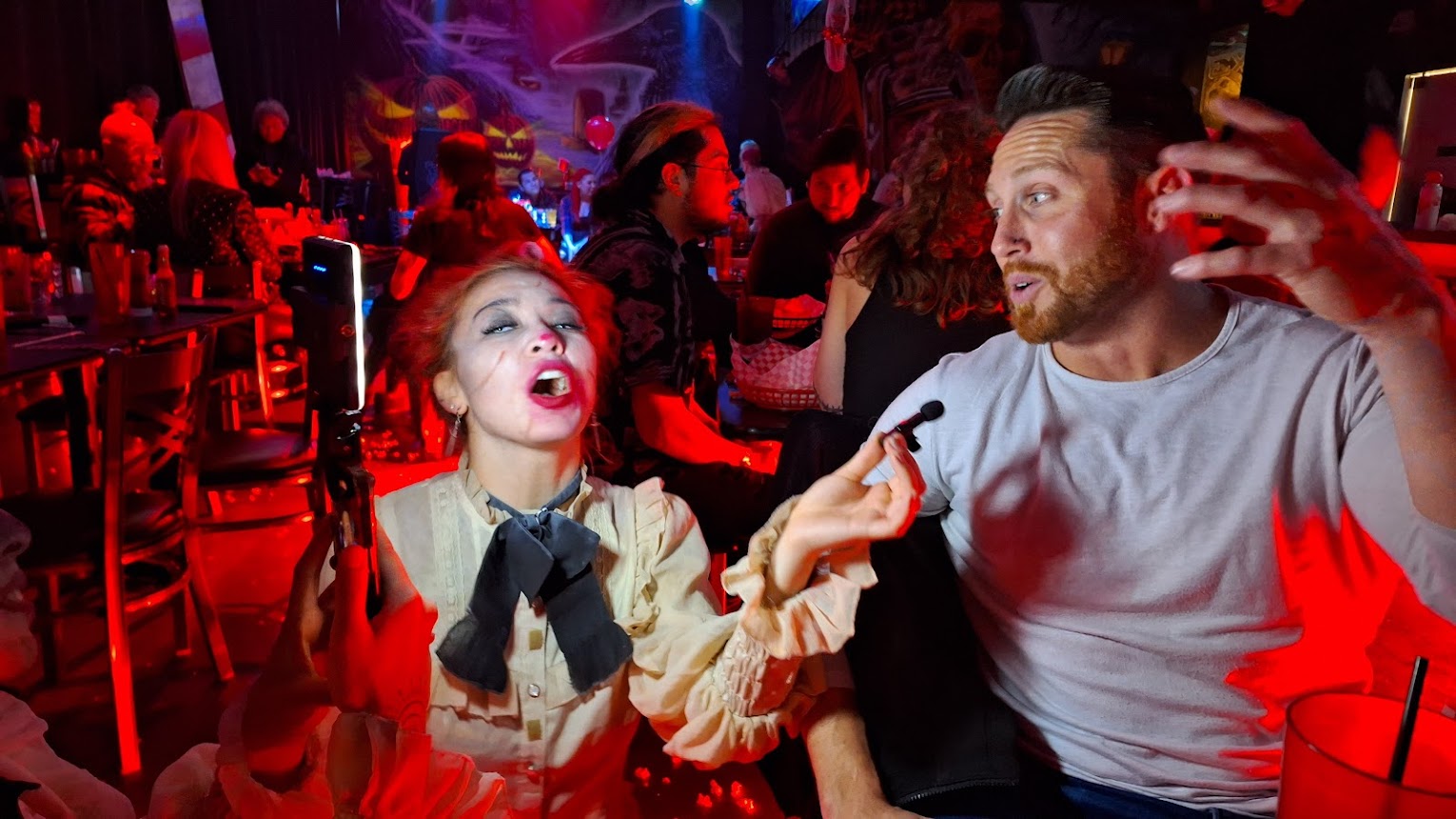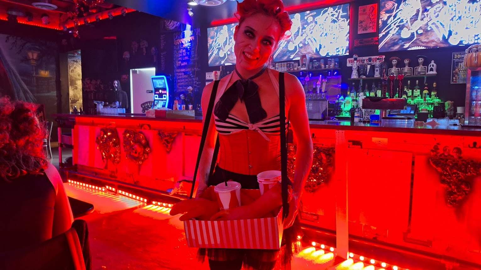 In the hour leading up to the show, servers will take your food and drink orders, Sinister "ushers" patrol the dining area, carrying their own macabre refreshments while lending an ominous tone. Video screens display a countdown to the 8 pm start time when all service stops and the thrills begin.