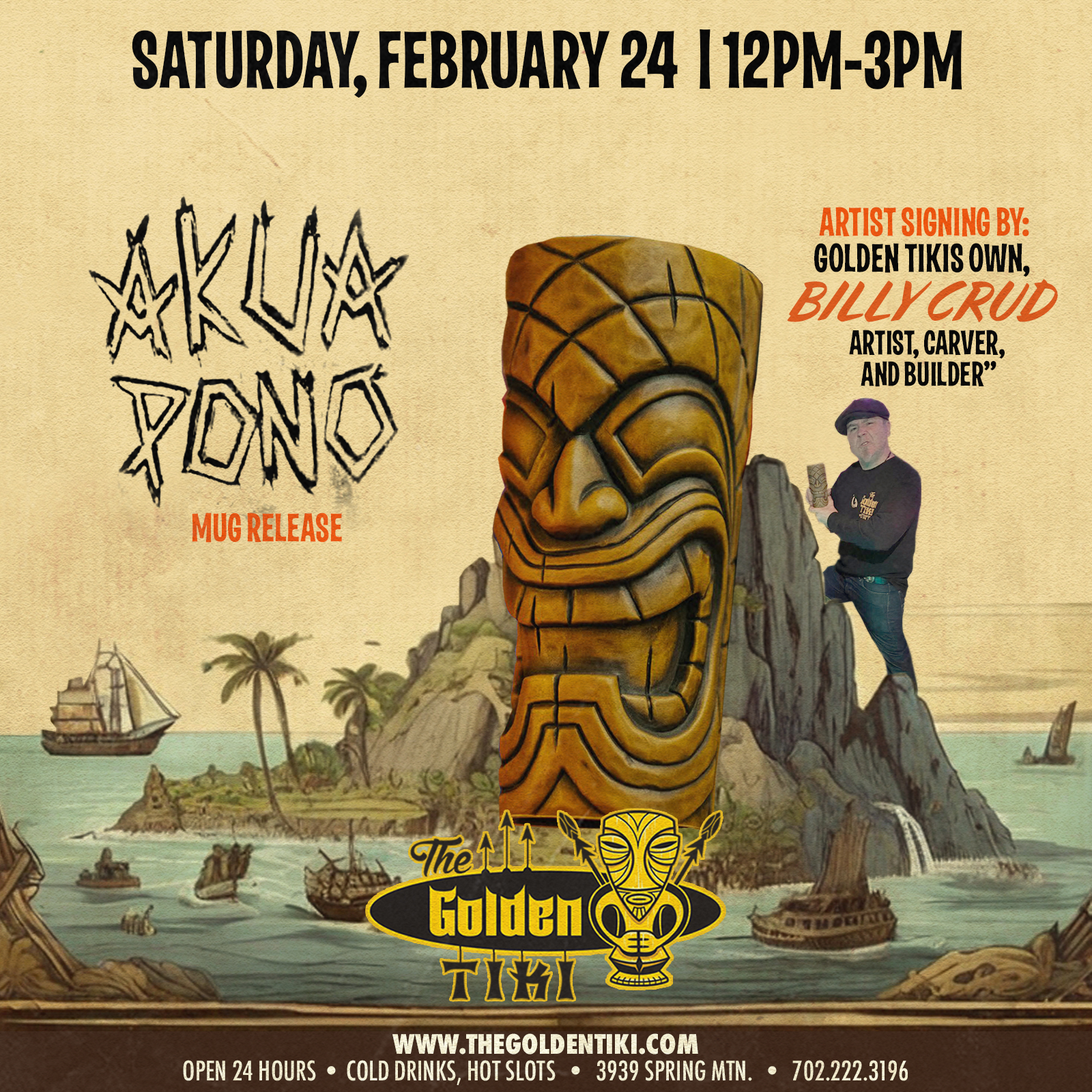 No tiki bar is authentic without actual carved tiki mugs. Vegas-based artist Billy Crud will be unveiling his latest designs for The Golden Tiki at a signing event on February 24th. From noon until 3 pm, meet Mr. Crud and have him autograph yours, available to purchase on-site that afternoon.