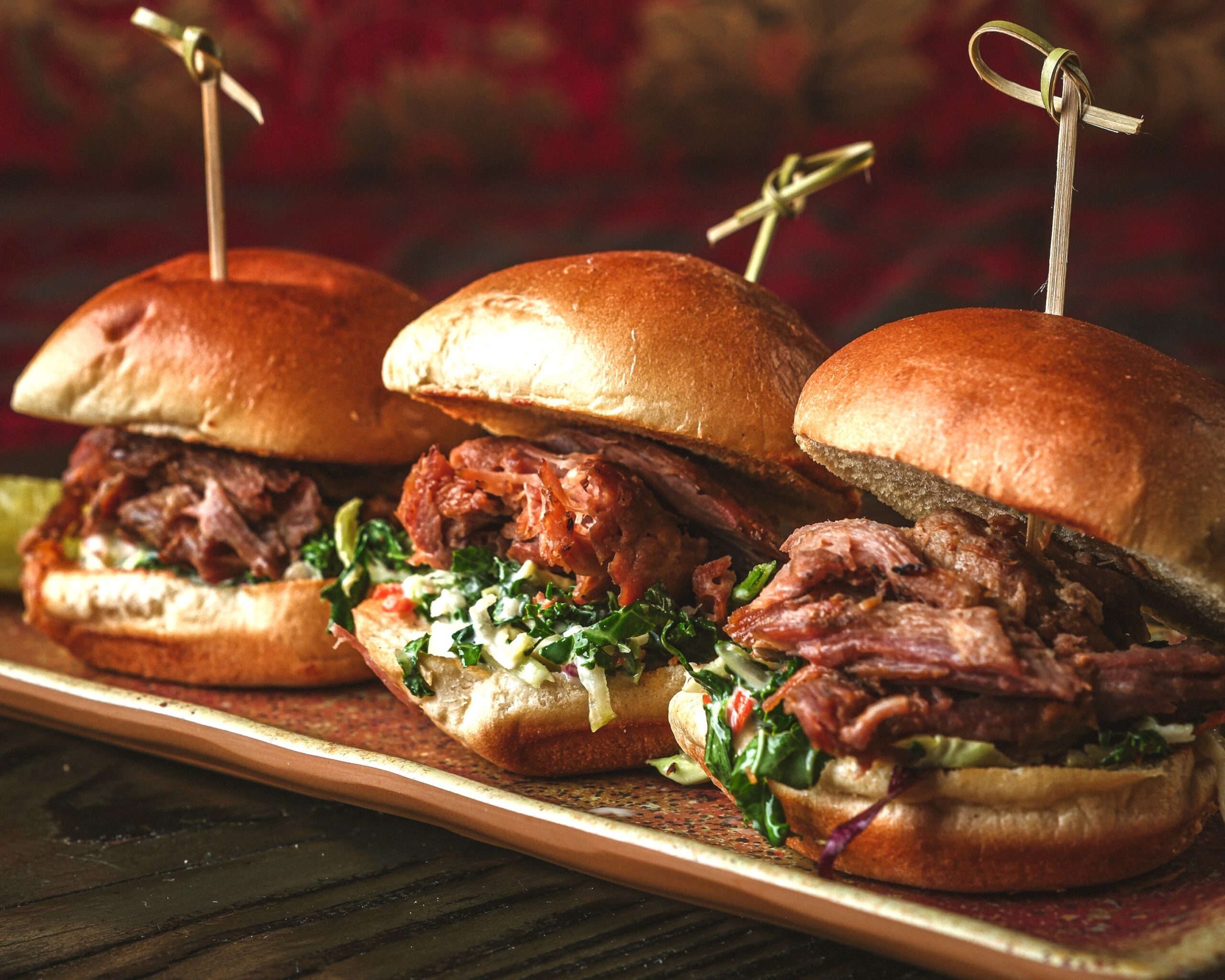 Pork Slider Trio - Three pork sliders piled high and topped with coleslaw - $16