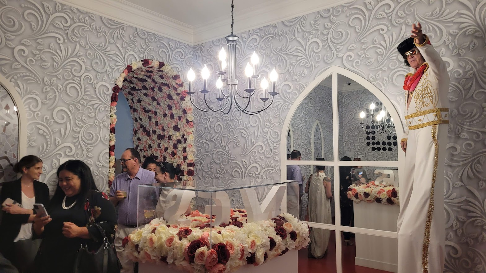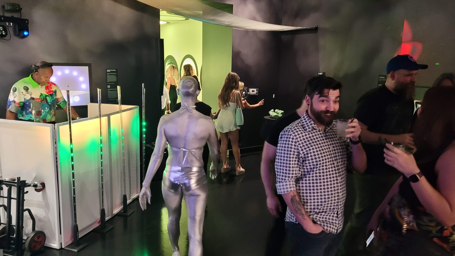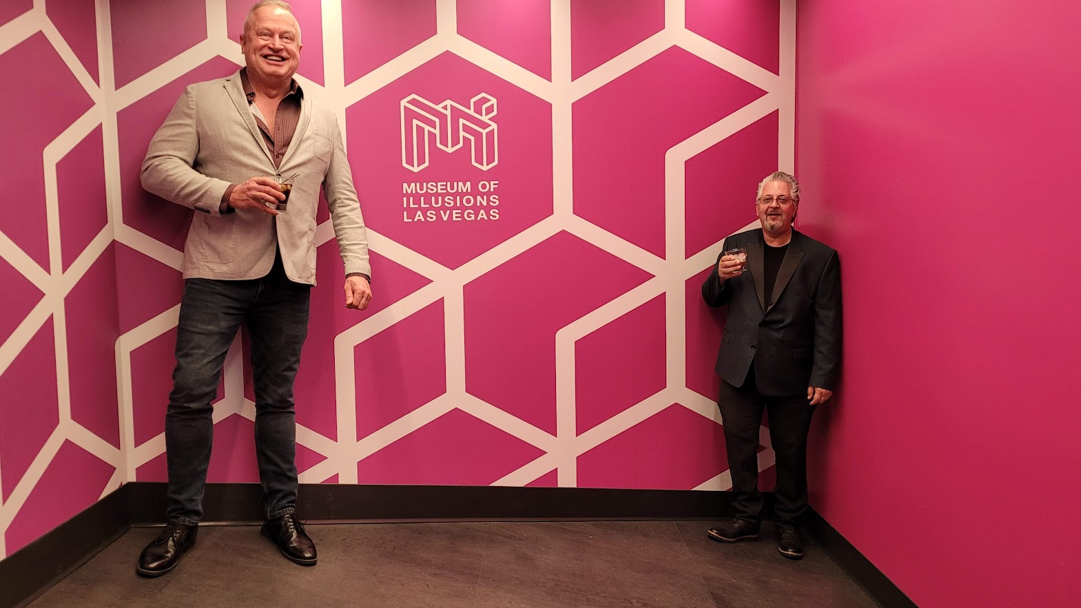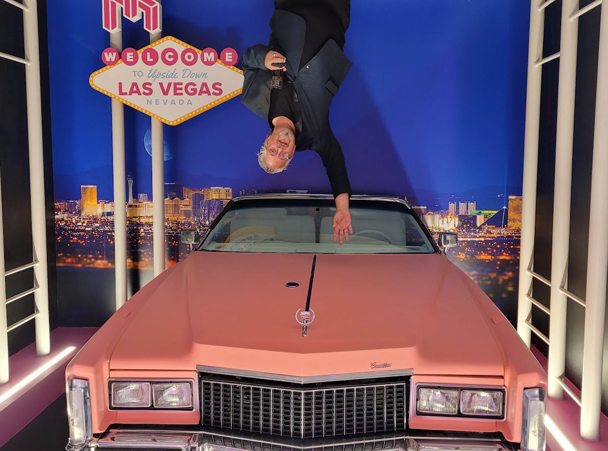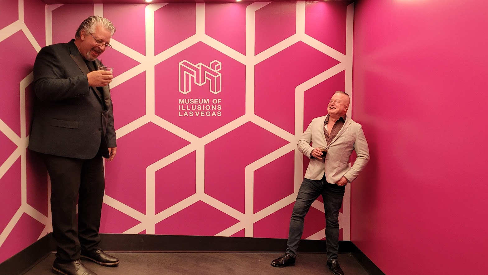 My guest for the evening was Aron Elekes of Go Live Vegas, a multi-media radio station, podcast studio, and live-streaming service company. Elekes was game to pose for photos at some of the eighty-plus exhibits. Cleverly designed displays allow you to alter your perspective while taking amusing yet puzzling photographs.