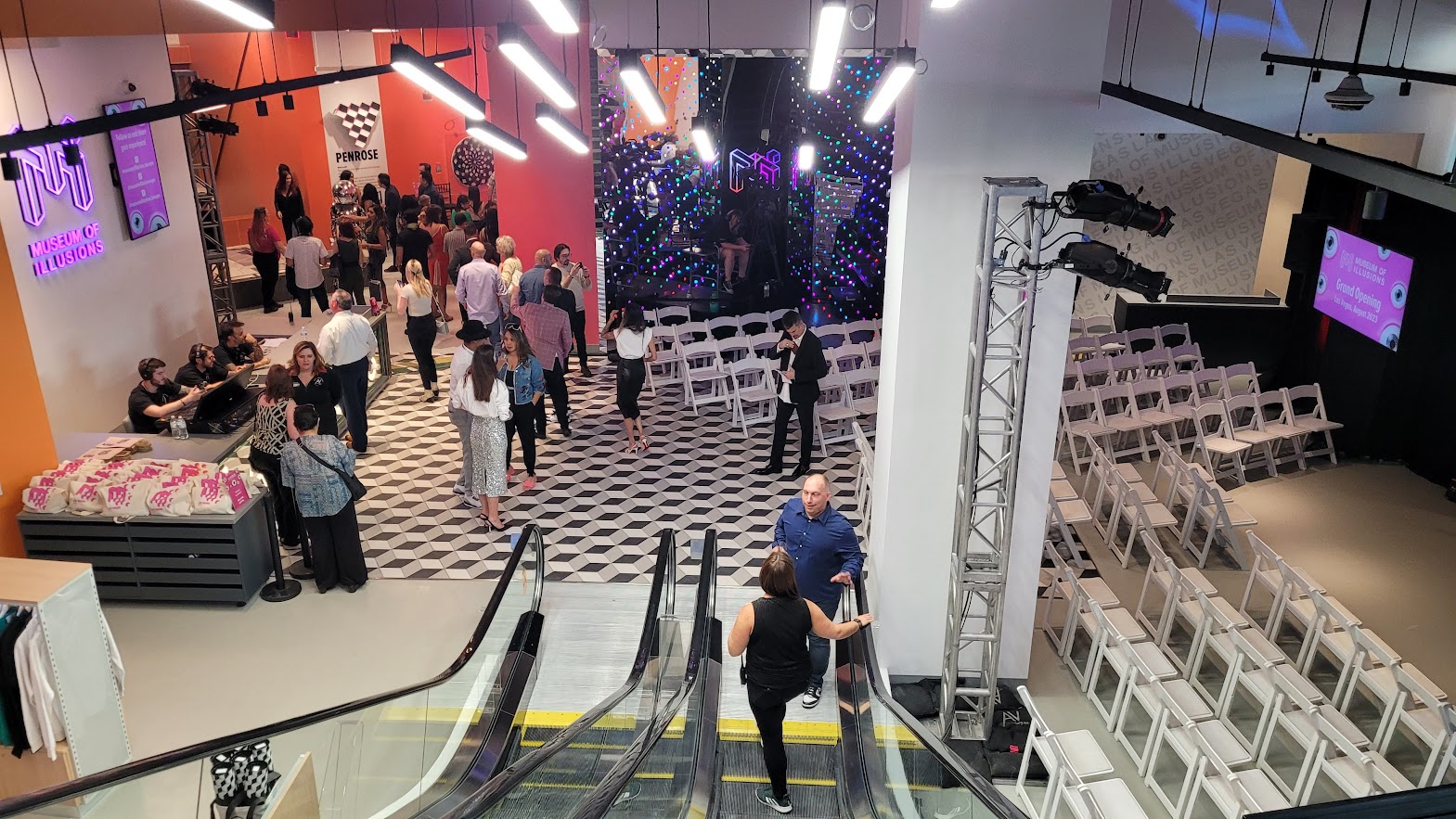 Entering from the second level, you take an escalator down into a bright, airy, and colorful lobby that doubles as a retail space. For the premiere gala on August 30th, the area was also tricked out for a performance by Rio Las Vegas headliner Michael Carbonaro (more on that later). Event production was handled by account manager Keith Purser and business development manager Hollie Cardinal for AV Vegas. Publicity and promotions for the Museum of Illusions are by Kirvin Doak Communications.