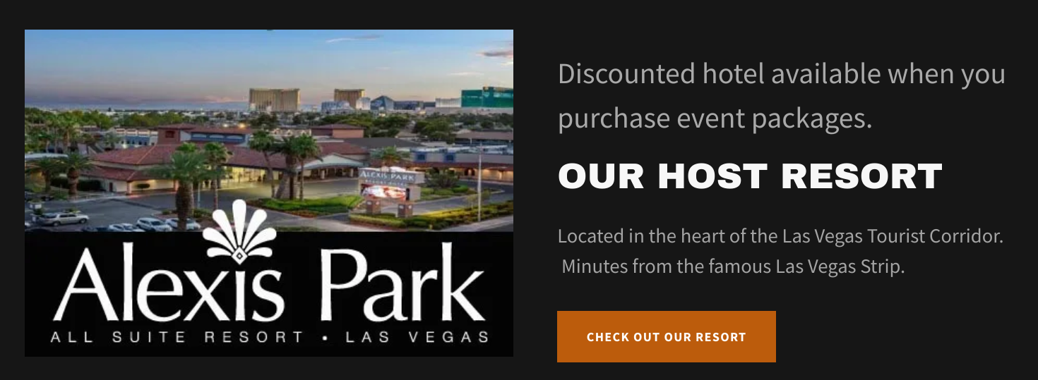 As mentioned above, the host hotel is ALEXIS PARK RESORT. Conveniently located near Harry Reid International Airport at 375 E. Harmon Avenue, the resort offers free parking, two pools, a restaurant, a full-service lounge, two showrooms, event spaces, and hundreds of suites. Those who purchase ticketing packages are eligible for discounted hotel rates. Get details here.
