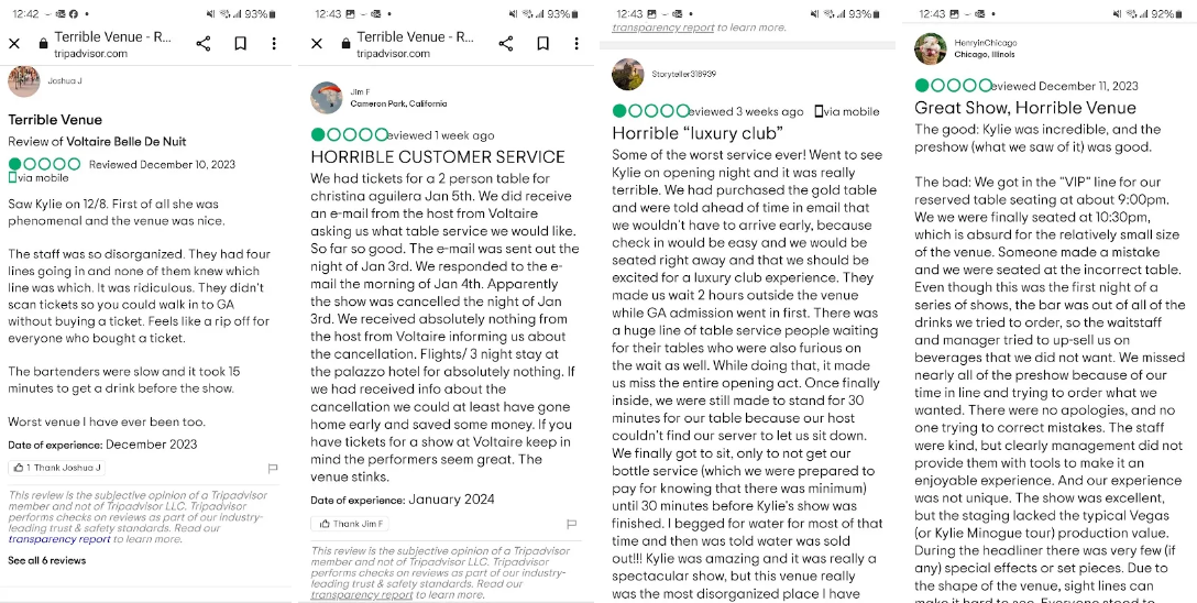 A quick visit to Yelp! and TripAdvisor demonstrates that the problem with canceled tickets is played out over and over. Patrons describe abusive, disrespectful behavior from management and staff, uncertain if they'll get refunds after spending exorbitant amounts for tickets, travel, and lodging. Manager "Brandon" has been singled out in many online complaints.