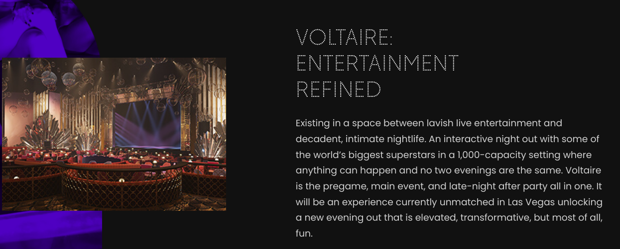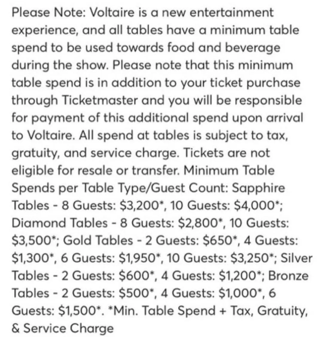 VOLTAIRE has been an absolute cluster-f*ck from Day One. The "New Entertainment Experience" requires each seated patron to spend hundreds of additional dollars in mandatory liquor charges, along with multiple fees and taxes. But selling those seats to the public was beyond VOLTAIRE's ability. Incompetence became immediately obvious when the venue was unable to handle its first round of ticket sales: