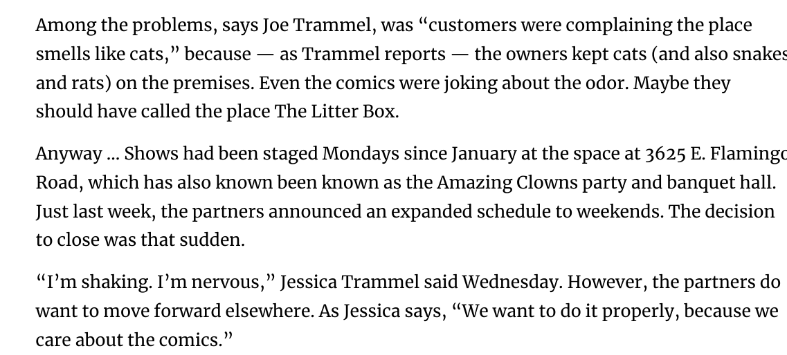 Within the press release was a link to this article, written by John Katsilometes and published on the website for Las Vegas Review-Journal at 9:50 pm on 3/14/24. Here are screenshots that display the segment referencing Wold's comedy club: