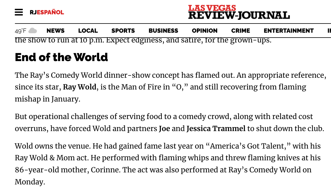 What you may notice is that none of the claims in the Review-Journal article come from Ray Wold himself. I spoke to Mr. Wold this morning via phone, then arranged to meet him and his family at the venue. I learned a number of eyebrow-raising details, first and foremost being that Wold was never contacted by John Katsilometes to confirm details as told to him by the Trammels. "We are not closed", Wold emphatically stated. He made it clear that Joe and Jessica Trammel are not partners in Ray's Comedy World, therefore they have no authority to make such statements. "They were employees, like I am for Cirque du Soleil. The Trammels have as much right to declare us "closed" as I do to announce that 'O' is closed at Bellagio".
