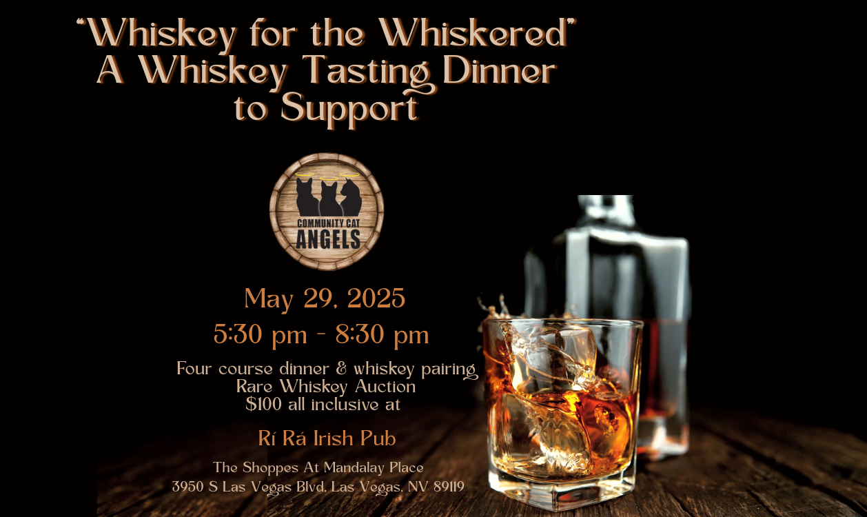 CCA's sole focus is to address the growing crisis of Las Vegas' feral and stray cat populations. It's comprised solely of volunteers. They receive no government funding and rely on the generosity of volunteers and donors to support their programs. Plus, they hold special events like the upcoming WHISKEY FOR THE WHISKERED dinner. Here's the announcement: