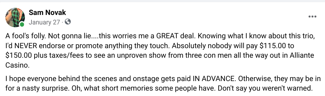 The City of Entertainment has shifted its focus from live entertainment to sporting events in recent years. This leaves perhaps thousands of show business professionals in positions of uncertainty. They, and we, have the right to question the intentions of producers with excessive bravado, troubling backgrounds, and questionable resources. As a fictional sports agent once said,