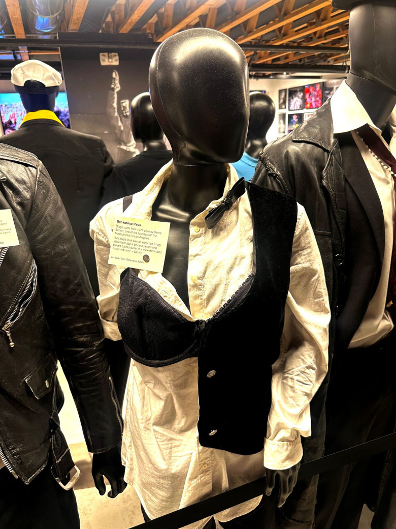 On the museum’s second floor, Genny pointed out the stage outfit that she created and wore from 1977 with Backstage Pass. She designed an ahead-of-it-time female/male wardrobe mashup as an “early nonbinary statement about being a person who played (punk) guitar in a male-dominated music industry.”