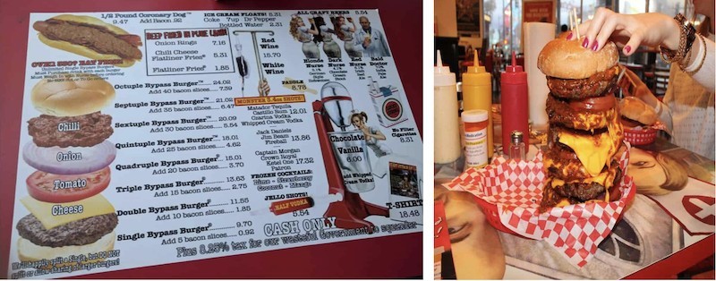 Nothing here is good for you. The menu is classic cheeseburgers, hot dogs, and milkshakes. The milkshakes are served with a hearty dollop of butter on top. Wine, beer, and hard alcohol are available too. Order a single patty Bypass Burger all the way up to an Octuple Bypass Burger; that s a burger with eight -lb patties! Every burger comes smothered in cheese, tomato, onion, chilli, and the option of adding several bacon slices.