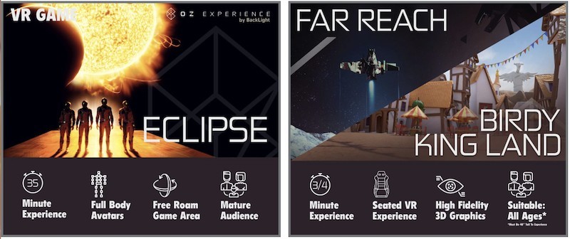 OZ Experience is an immersive virtual reality game. There are few different options for gameplay. Eclipse is a 35-minute multiplayer experience that takes place on a spaceship in 4D with full-body avatars and allows you to roam freely. There s also OZ Ride, 3-4 minute experiences where you re seated. You can choose between Far Reach, a space adventure, or Birdy King Land, a motorcycle chase.