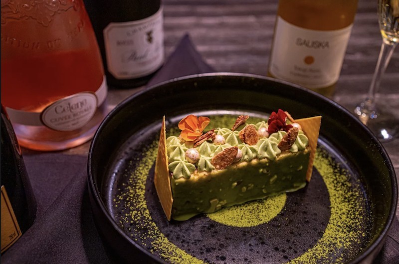 Can t forget dessert. The Green Tea Crunch Bar is already popular. It s a cake filled with chocolate and green tea mousse topped with crunchy candy almonds.