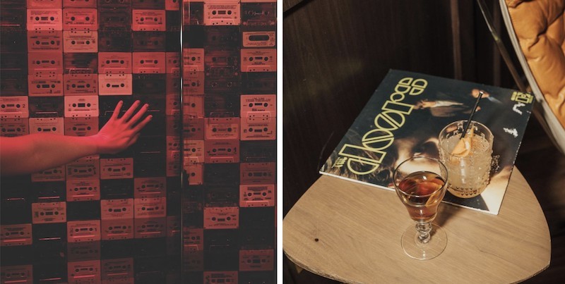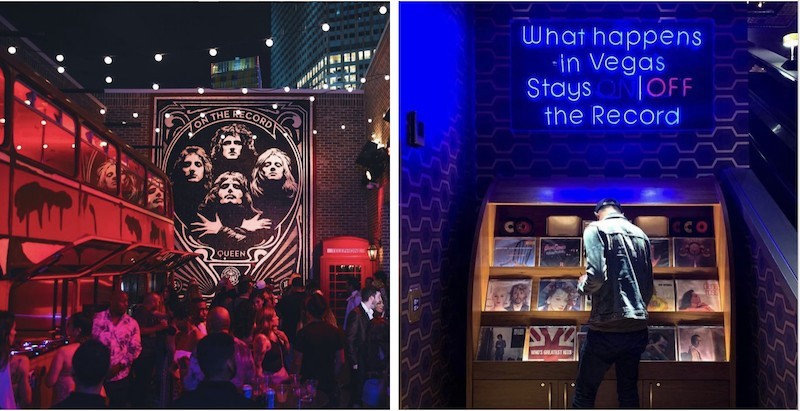On The Record, a secret bar at The Park MGM. Once you find the disguised door to enter the bar (hint: it s covered in cassette tapes), you ll find walls full of tons of vinyl records. If you pull one off the shelf and take it to the bar, they ll make you a custom cocktail! You can actually buy these records to take home.