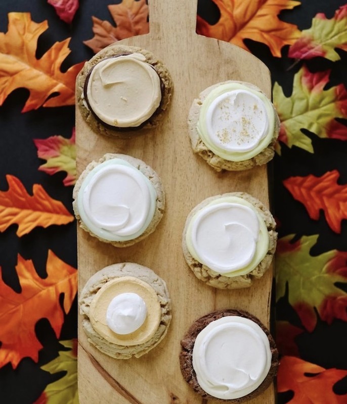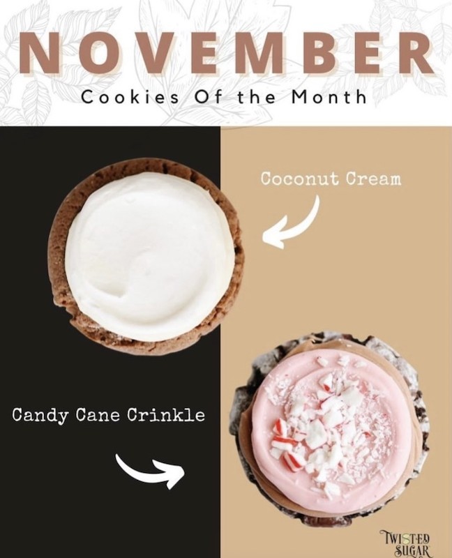 November's cookie flavors are "Candy Cane Crinkle," a brownie cookie topped with fudge and peppermint frosting and candy cane pieces, and "Coconut Cream." Signature Cookies like Chocolate Chip, Frosted Sugar, Oatmeal Chocolate Chip, and "Twisted Sugar," a sugar cookie with coconut frosting and a lime wedge on top, are constantly available. Indulgence Cookies like Caramel Sugar, Banana Cream, Oatmeal Cookie Butter, Cookies & Cream, and Pumpkin Chocolate Chip are also staples on the menu. Gluten-free cookies are made here too.
