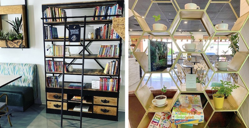 In addition to a great menu, this shop is adorable! Notice the details like the faux hedge wall, huge chalkboard full of doodles, hexagon shelves, and the lending library full of books that you can browse through while sipping on your favorite drink.