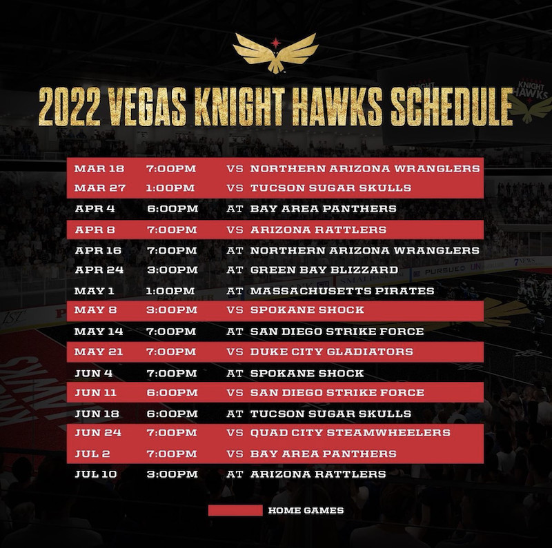 The Vegas Knight Hawks indoor arena football team will start its inaugural season on March 18. Their home will be at the new Dollar Loan Center Arena in Henderson where the Silver Knights AHL hockey team will also play.