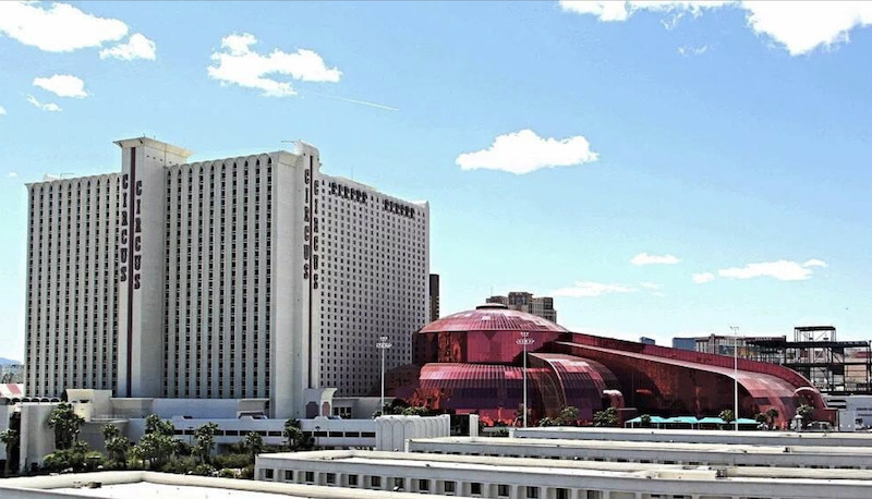 The theme park is located inside the Circus Circus Hotel & Casino. You can see it from the outside; it s bright pink!