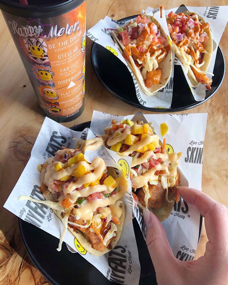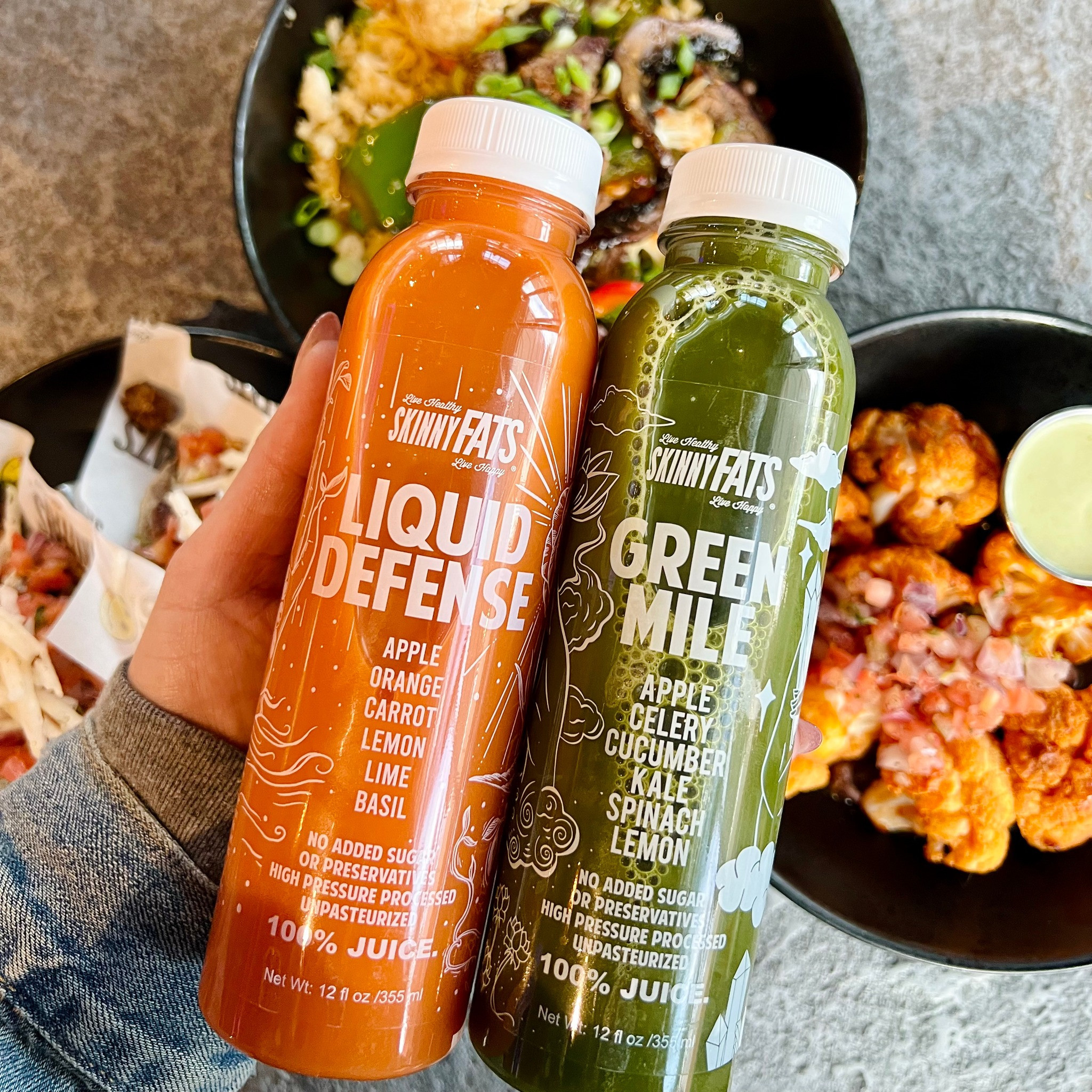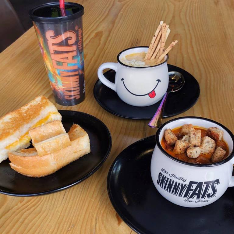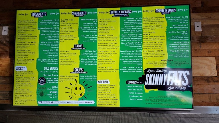SkinnyFATS apart from stodgy clean eating establishments. You ll know you re in for fun the moment you walk in the door and are greeted with a chorus of hello! and welcome! . That positive attitude is enhanced with colorful decor, carefully-selected music, and a relaxing, inviting design. The restaurants are counter-service style but you ll still feel pampered from the ordering process to your final bite.