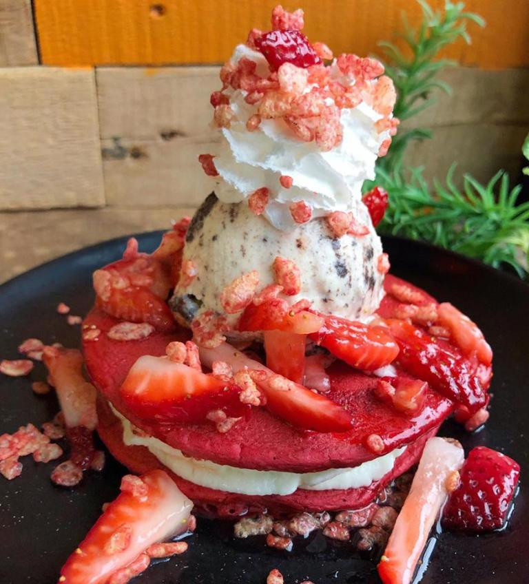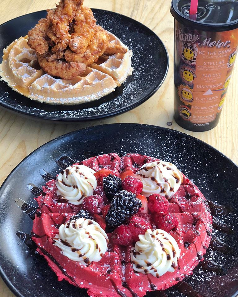 Berry Strong, a protein waffle topped with berries, strawberry chia jam, orange agave, and turkey bacon.