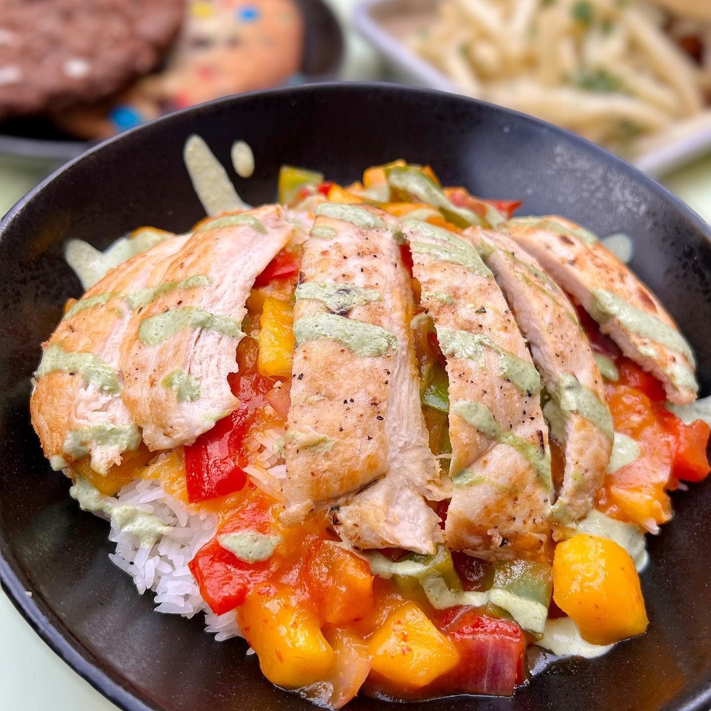 Smoke In A Bowl piles agave barbecued chicken, peppers, onions, black bean salsa, pineapple and cilantro yo over a bowl of jasmine rice.