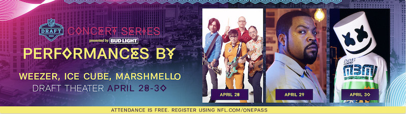 free concerts each night at the Draft Theater! Weezer performs on Thursday, Ice Cube on Friday, and Marshmello on Saturday. Thursday and Friday concerts will start at 8:30 pm, and Saturday will start at 5 pm.