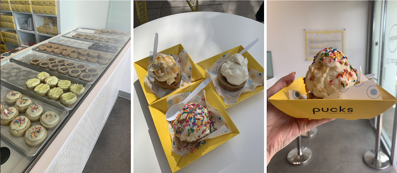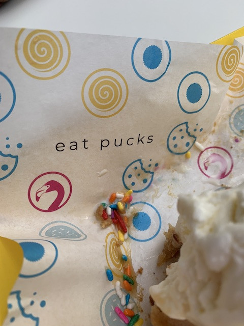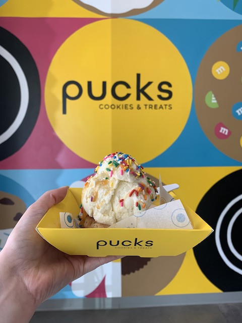 The Puck Drop is a cookie with ice cream on top. You can choose what flavor of cookie you want; there s chocolate chip, chocolate macadamia, peanut butter, peanut butter cup, vanilla icing, lemon icing, and cookies + cream. Then, it can be topped with vanilla or chocolate ice cream, along with your choice of chocolate, caramel, or Nutella, and m&ms or sprinkles.