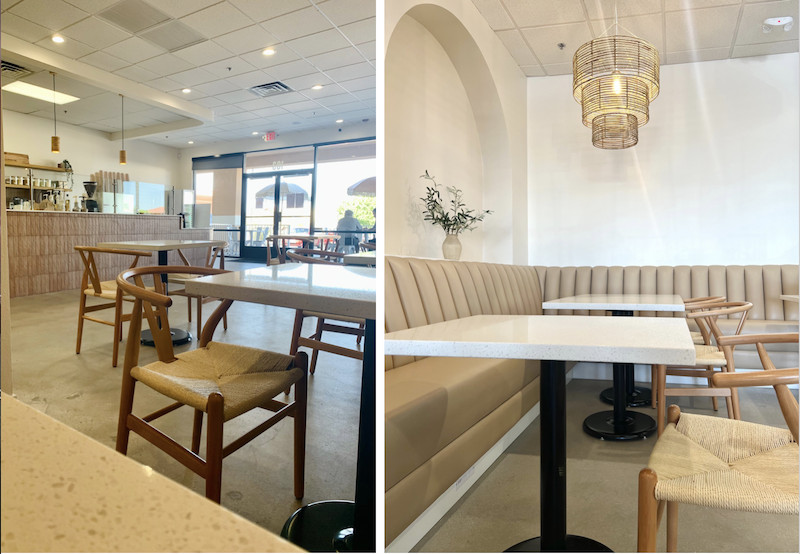 Toast Society Henderson is relaxing and gives off beachy vibes. Light wood accents, pops of light pink, and plants are all around the tables and booths. Plus, the front patio is shaded with umbrellas so you can dine outside.