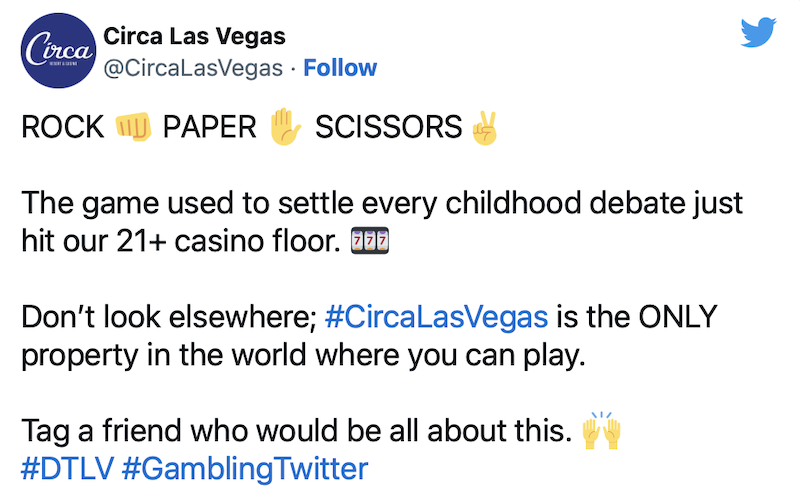 Circa in downtown Las Vegas recently debuted a new Rock, Paper, Scissors-themed slot machine on their casino floor. On Wednesday, October 12, the casino tweeted, “The game that used to settle every childhood debate just hit our 21+ casino floor. Don’t look elsewhere; Circa Las Vegas is the only property in the world where you can play.”