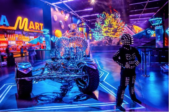 The 200,000 square foot space comprises 60 installation-filled rooms made by several renowned artists and includes several portals and terrains. There are four principal themed areas starting with Omega Mart, designed like a massive box grocery retail outlet. Here, you will find some unique custom-made products such as Nebula loaf and Americanized beef.