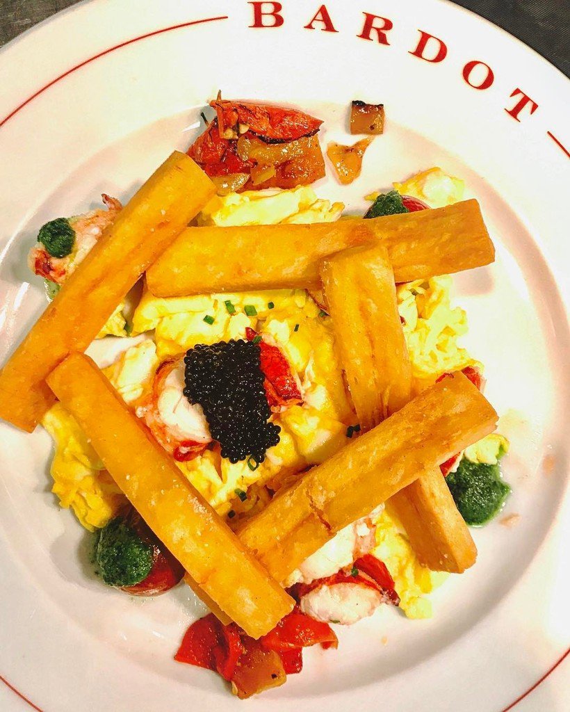 Main Lobster Scramble, caviar, bloomsdale spinach, puperade, fresh basil, and cherry tomatoes[/caption]
