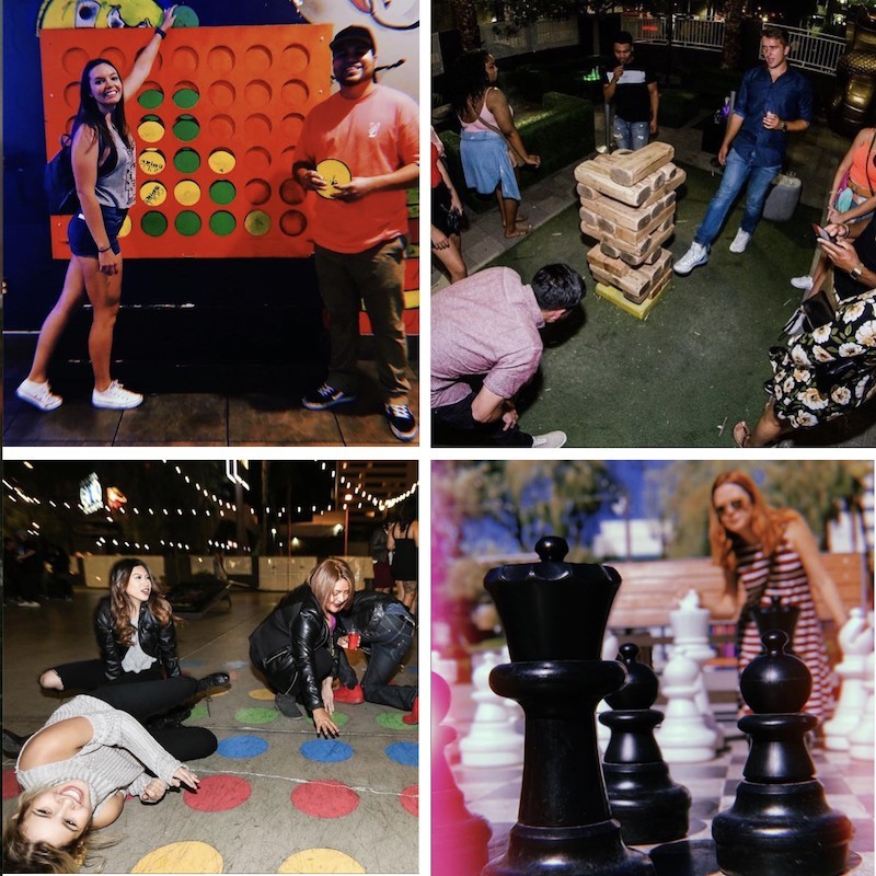 Head outside to the Backyard and Playground. This is where you ll find tons of oversized games. Play Giant Beer Pong made out of trash cans, Octopong, Cornhole, Twister, Ping Pong, plus life-sized Chess and Jenga!