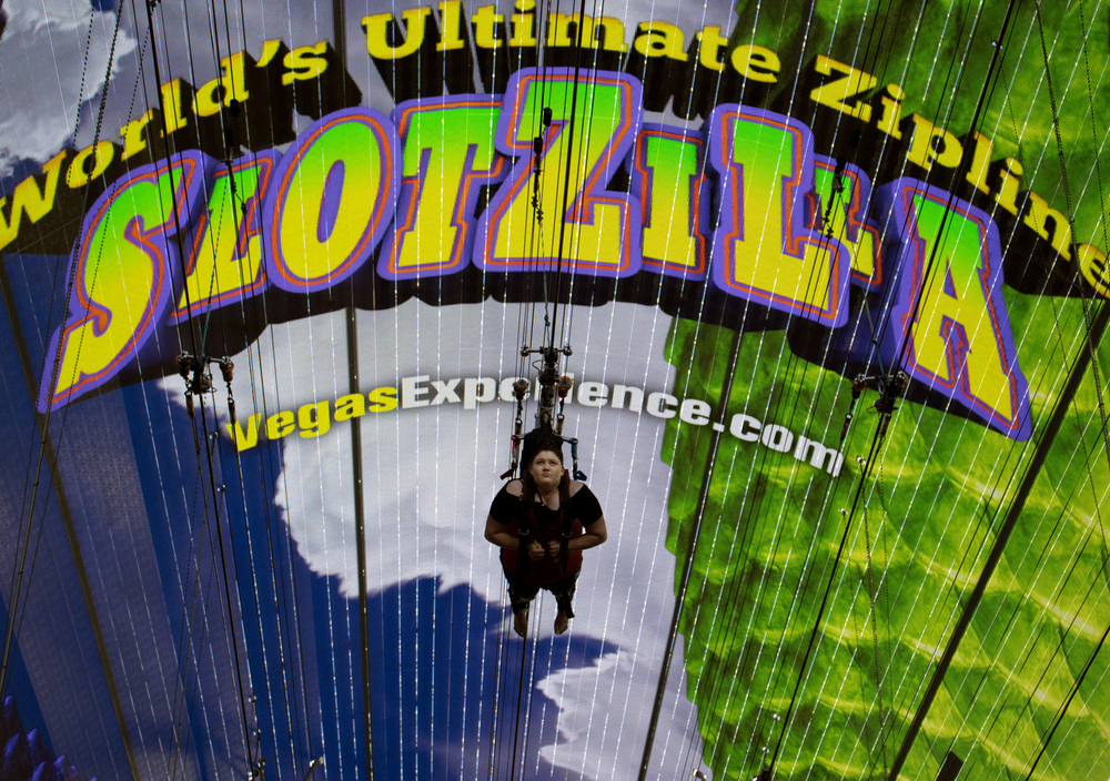 SlotZilla Zipline is a thrill seeker’s favorite attraction in Vegas. It has two options: you can fly seated from 7 stories or take the Super Hero Zoom, where you lay flat and fly from 11 stories high.