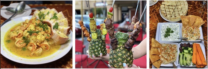 Marrakech offers guests a six-course meal, also known as the Prix Fixe Feast, for $50 per person. It includes Mediterranean Shrimp Scampi, Traditional Moroccan soup, hummus with olives and vegetables, Beef Kabob, Couscous and Chicken, and a dessert of B Stilla, a Moroccan pastry, and mint tea. Homemade bread is served with each course. Wine, beer, and cocktails are available but are not included in the meal price.