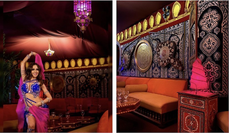 This dining experience is anything but typical. The inside of the restaurant looks like you ve stepped into a silk-draped tent filled with lanterns, bold patterns and colors, and lavish gold decorations. It s an intimate setting, with floor-level cushions and smaller tables. Take a seat and enjoy the show that is about to unfold!