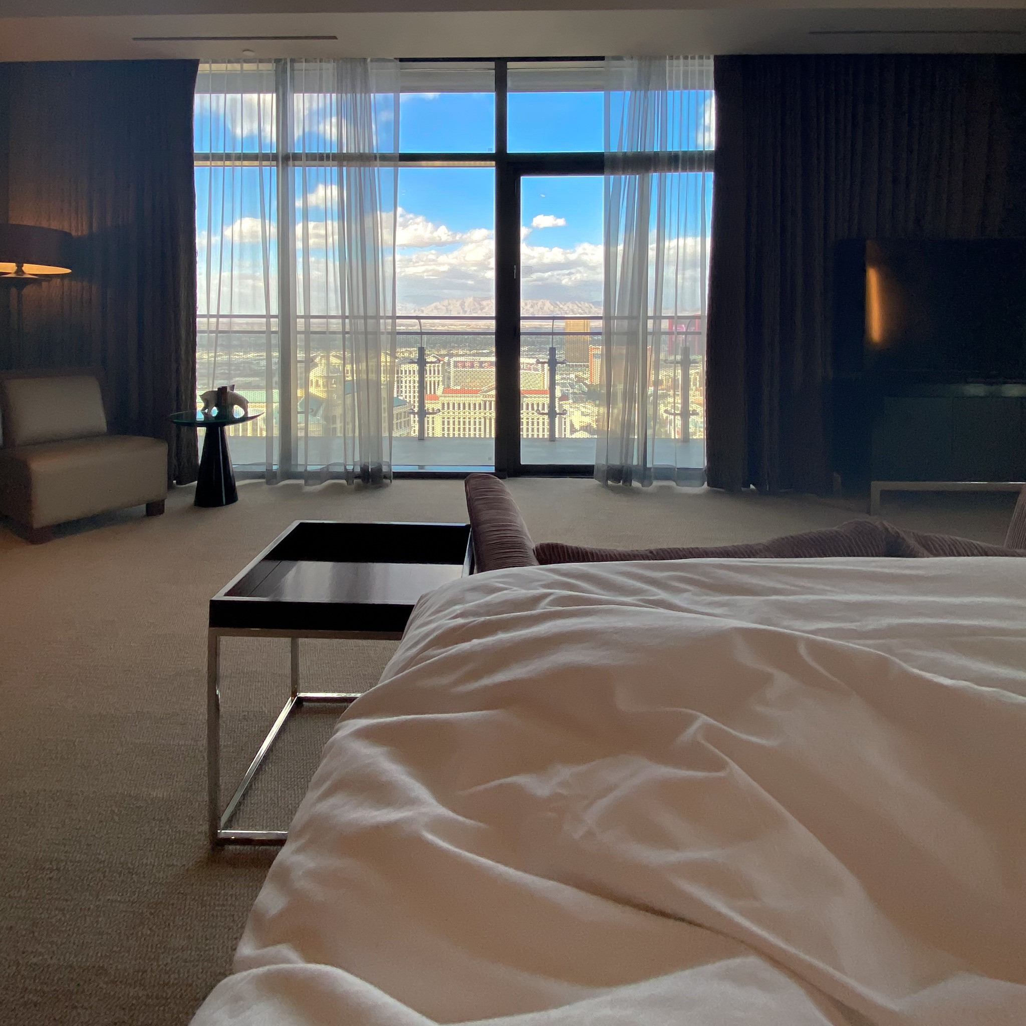 The bathrooms are impressive, and the size and design depend on the type of room or suite you choose. For example, the Tower One Bedroom has a unique Japanese-style tub overlooking the Strip.