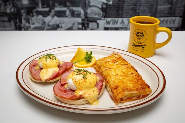 Saginaw's Delicatessen inside Circa Las Vegas. A must-try from this restaurant is the steak and eggs combo, which is delicious and quite filling. Different style eggs go well with hash browns, bacon, and other menu items for a complete meal. Enjoy your favorite hot beverage with an English muffin spruced up with a tasty Hollandaise and some breakfast potatoes.