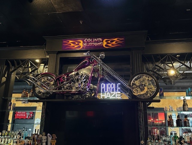 One of the Count's Kustoms' motorcycles, Purple Haze, adorns the top of the bar at Count's Vamp'd.[/caption]