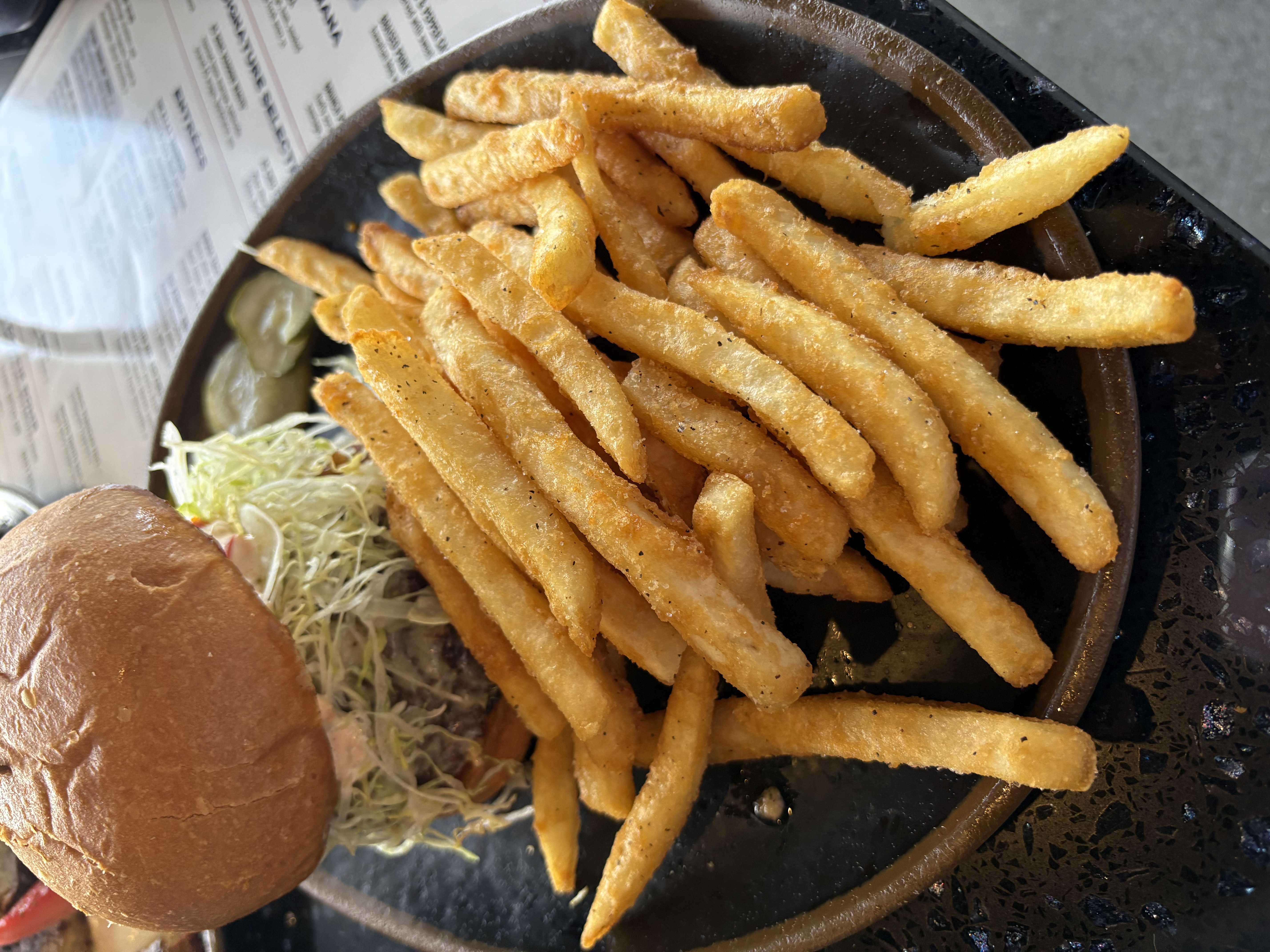It was time for a savory bite. We ordered the Atomic Burger ($23), which came with caramelized onion and roasted tomatoes. The burger was messy and oozing in all the right ways, the patty dripping with melted cheese and tangy sauce. The fries were thin-cut and seasoned, which is precisely how I like them.