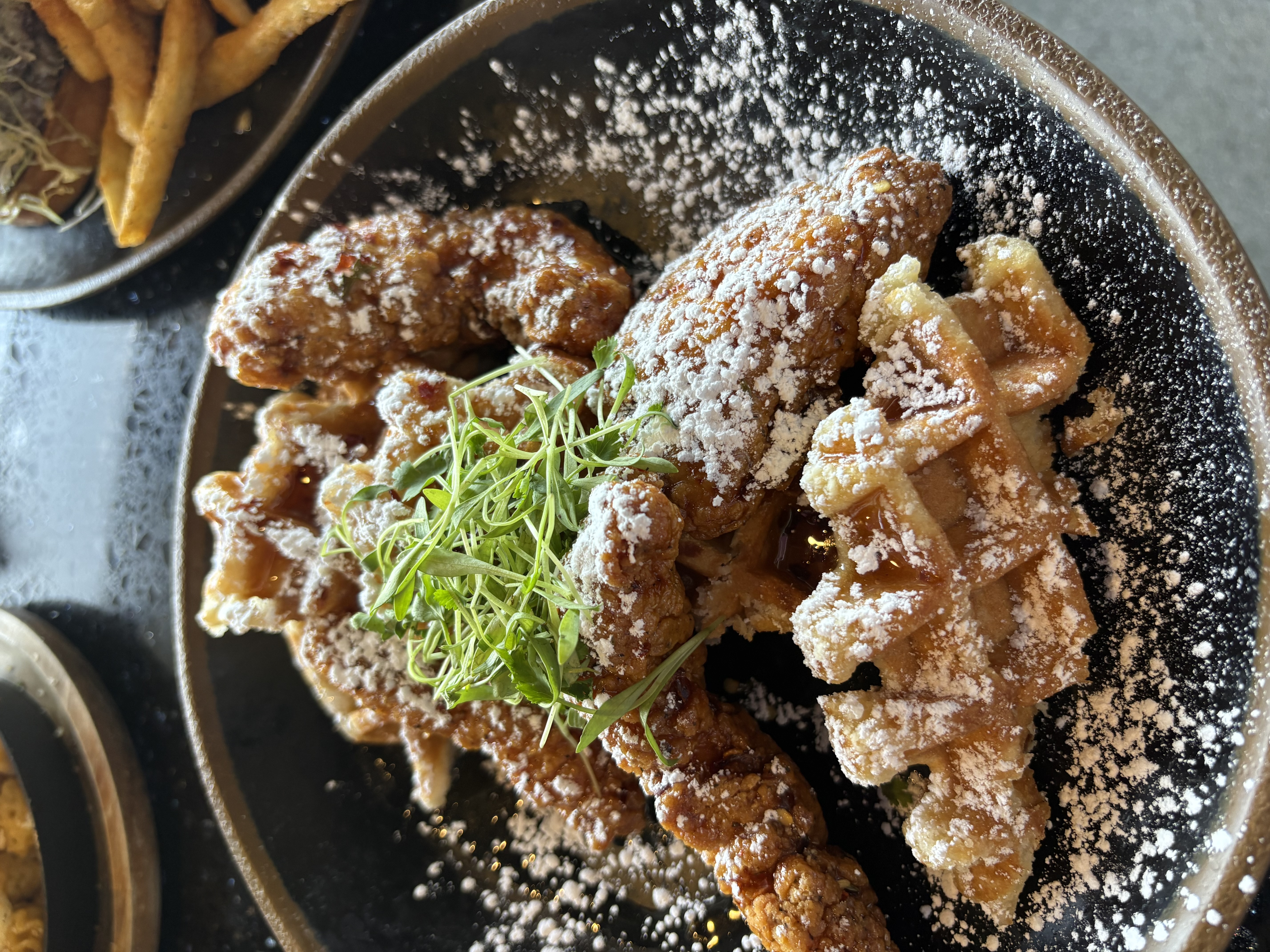 Next up: Chicken and Waffles ($19), but with a twist. Instead of plain maple syrup, it came with spicy syrup and a dusting of powdered sugar. The well-seasoned chicken was perfectly juicy, but the spicy syrup had too strong a kick for my wimpy tastes.