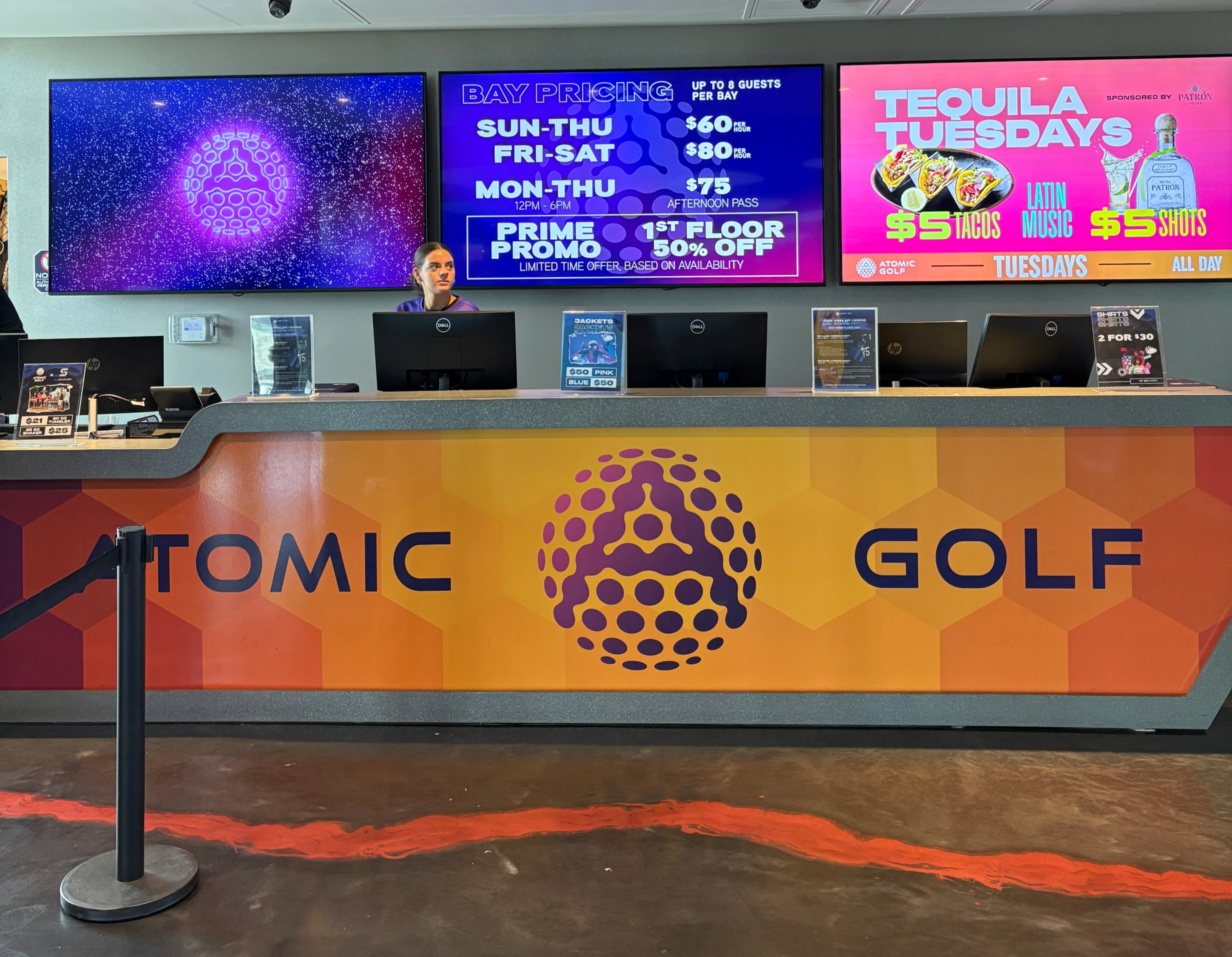 Atomic Golf is about gamified experiences. The bays fit up to eight people and have touch-screen monitors that display real-time game stats.