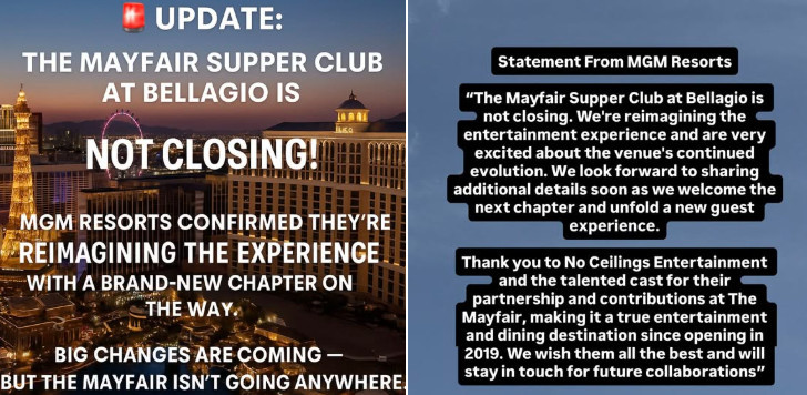 The news spread like wildfire, and even yours truly briefly fell for the rumors suggesting that MAYFAIR SUPPER CLUB at Bellagio Las Vegas was shuttering. It didn't take long for MGM Resorts to counter the gossip with an official announcement (above).