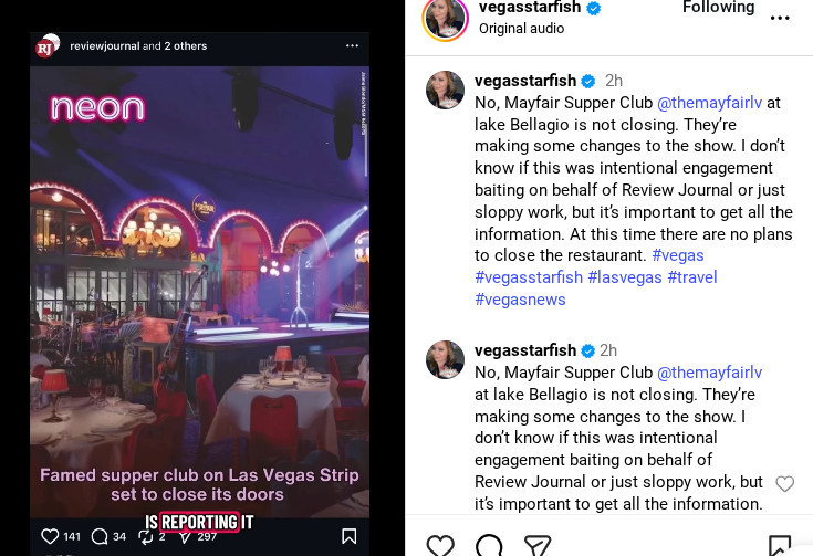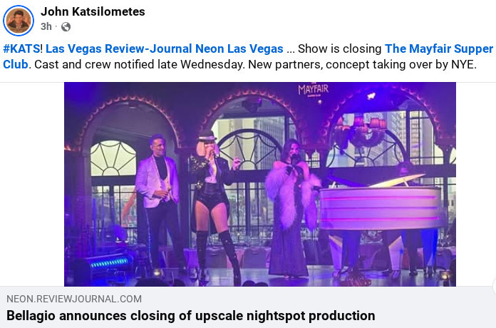 The confusion stemmed from an announcement by John Katsilometes of the Las Vegas Review-Journal (above), which led many to believe that the entire business was shuttering. In reality, the live production that takes place within the dining room is being replaced by another, causing for a pause in entertainment.