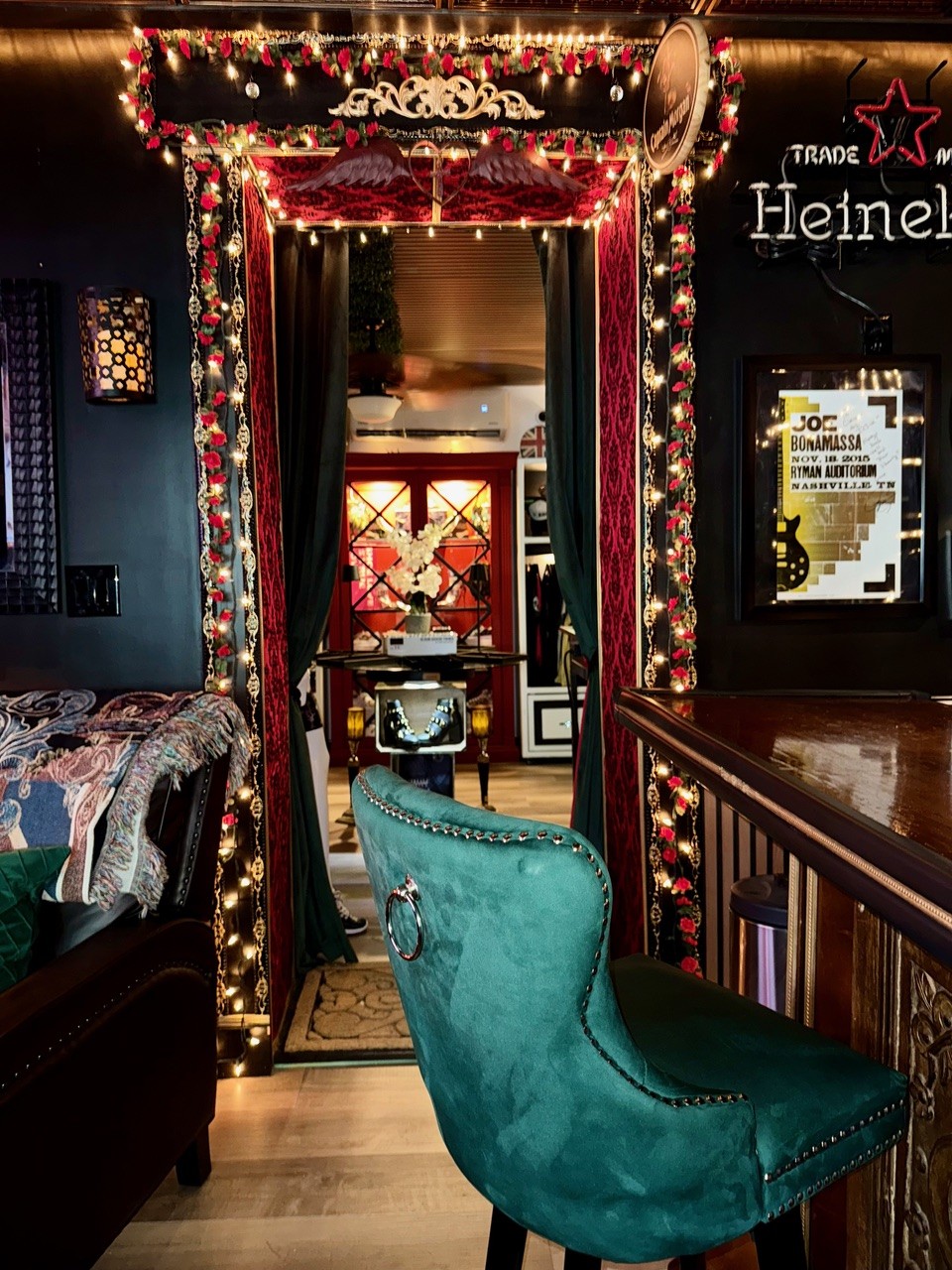One of the hippest places to shop in Vegas for gals and guys is not even a walk-in retail store. Located in the mid-century-rich area of Vegas’ east side, ICJUK is a private, custom-built showroom that’s strictly by appointment only, although you can shop online 24/7. “It’s like a secret rockstar closet hidden in Vegas, with a British pub feel,” says British designer and owner Claire Vranian. “Think wearable art, edgy glam, and walls lined with one-of-a-kind designs. It’s cozy, private, and full of character. I love textures and deep solid colors—the decadence of old-school Hollywood mixed with Henry VIII velvets and feathers!”