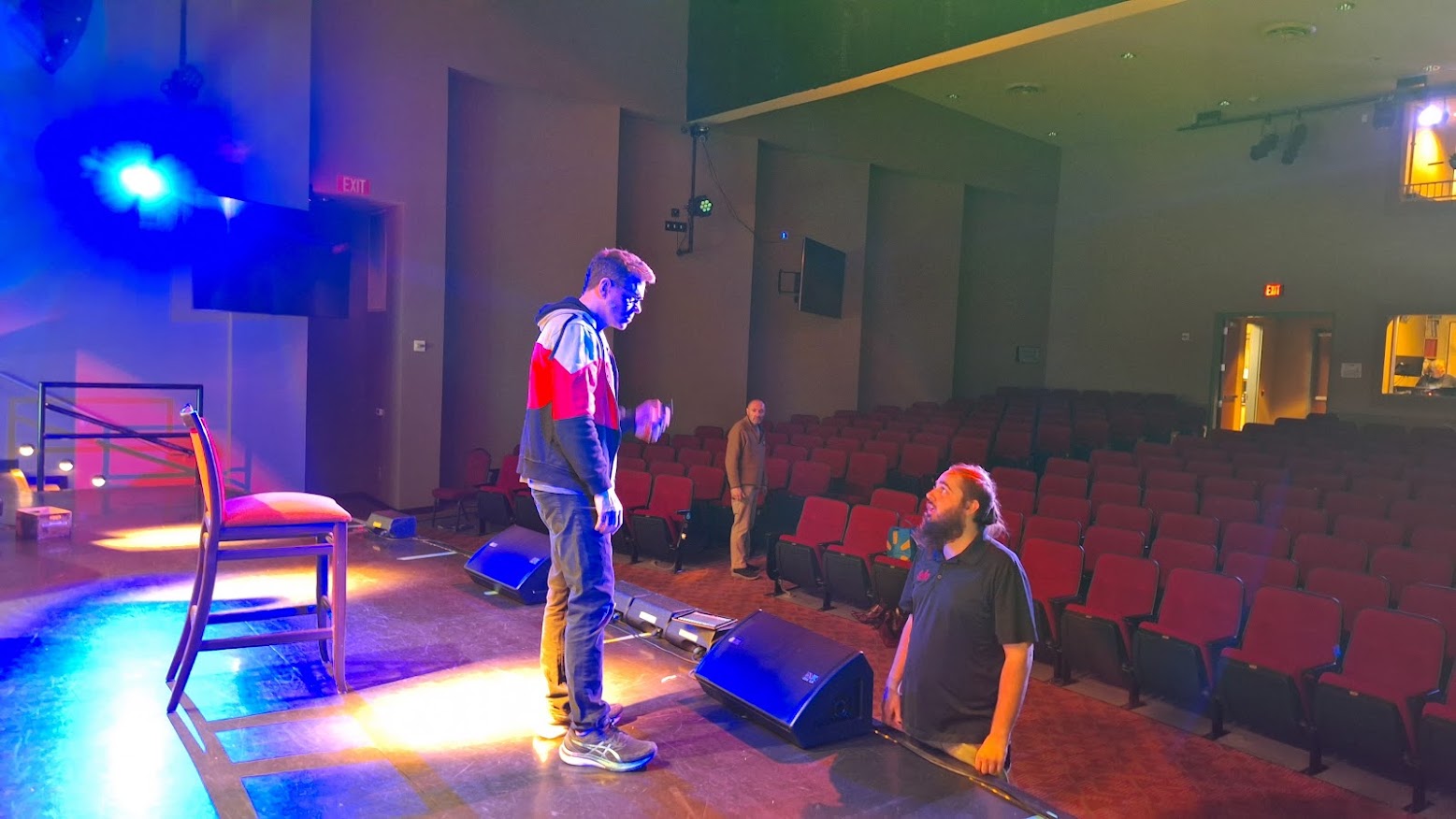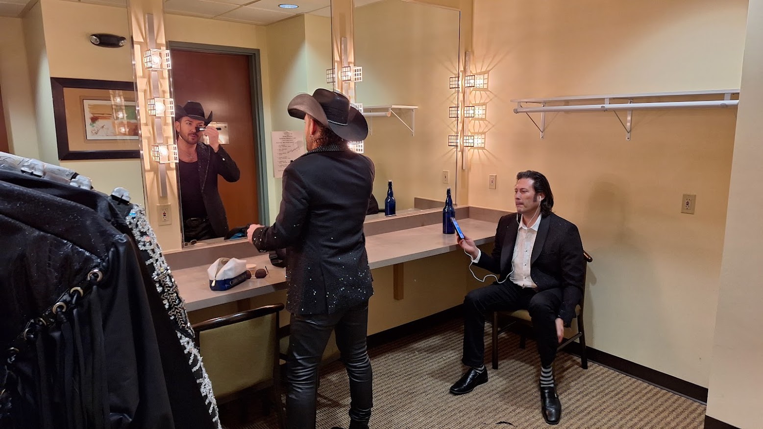 As show guests arrive with their costumes and accessories, technicians test the lighting and sound systems. Microphones, video monitors, and speakers must be checked one by one. When all are confirmed to be operating, Mark will have each guest run through their number(s).
