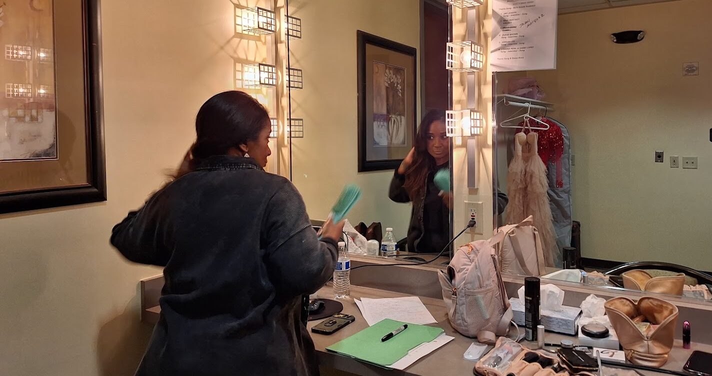 Vocalist Jordan Lee preps her hair before getting dressed for the show